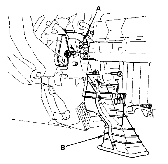 4. Remove the wire harness clip (A), the self-tapping screws, and the passenger's heater duct (B).