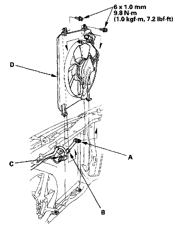 5. Disconnect the connector (A) from the A/C condenser fan motor. Remove the wire harness clip (B) and the connector clip (C). Remove the upper mounting bolts, and the A/C condenser fan shroud (D). Be careful not to damage the radiator fins when removing the A/C condenser fan shroud.
