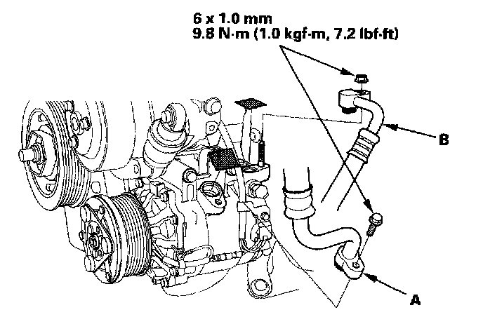 6. Remove the bolt and the nut, then disconnect the suction hose (A) and discharge hose (B) from the A/C compressor. Plug or cap the lines immediately after disconnecting them to avoid moisture and dust contamination.