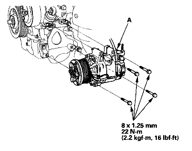 7. Remove the mounting bolts and the A/C compressor (A). Be careful not to damage the radiator fins when removing the A/C compressor.