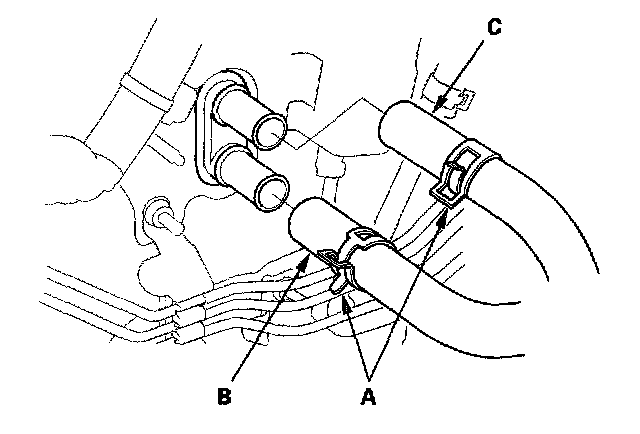 5. From under the hood, slide the hose clamps (A) back. Disconnect the inlet heater hose (B) and the outlet heater hose (C) from the heater unit. Note the orientation of the hoses.