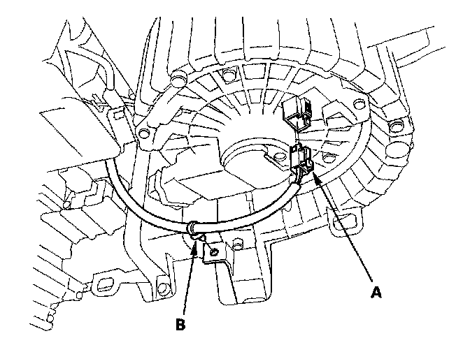 8. Disconnect the connector (A) from the blower motor. Remove the wire harness clip (B).