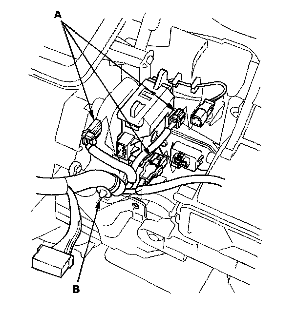 10. Disconnect the connectors (A) from the mode control motor, the evaporator temperature sensor, and the power transistor. Remove the wire harness clip (B).