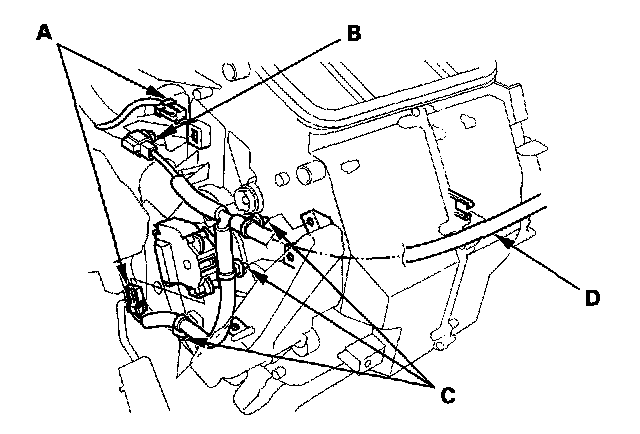 11. Disconnect the connectors (A) from the air mix control motor and A/C wire harness. Remove the connector clip (B), the wire harness clips (C), and the wire harness (D).