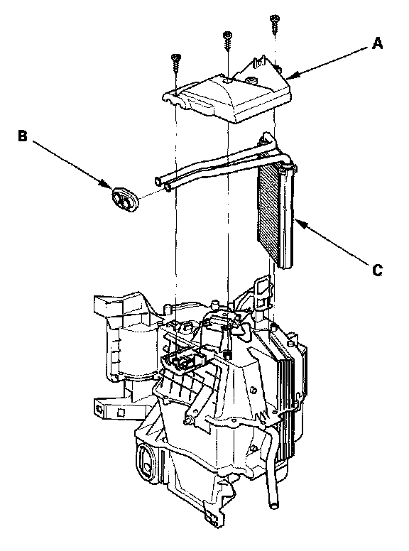13. Remove the self-tapping screws, the heater core cover (A), the grommet (B), and carefully pull out the heater core (C).