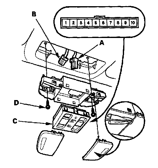 2. Disconnect the moonroof switch 10P connector (A) and map light 3P connector (B).