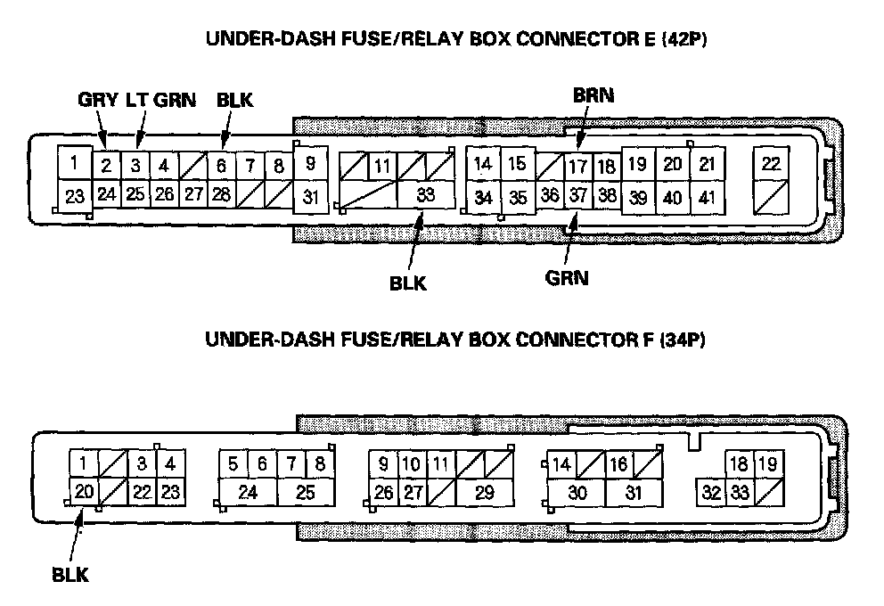 3. Disconnect the under-dash fuse/relay box connectors E, F, G, K, Q, and T.