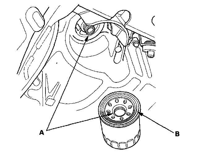 3. Inspect the threads (A) and rubber seal (B) on the new filter. Clean the seat on the oil pan, then apply a light coat of new engine oil to the filter rubber seal. Use only filters with a built-in bypass system.
