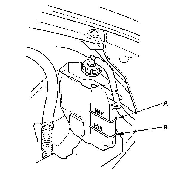 Coolant Check1. Look at the coolant level in the coolant reservoir. Make sure it is between the MAX mark (A) and MIN mark (B).