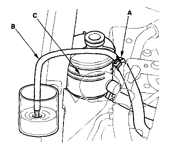 2. Connect a hose (B) of suitable diameter to the disconnected return hose, and put the hose end in a suitable container.