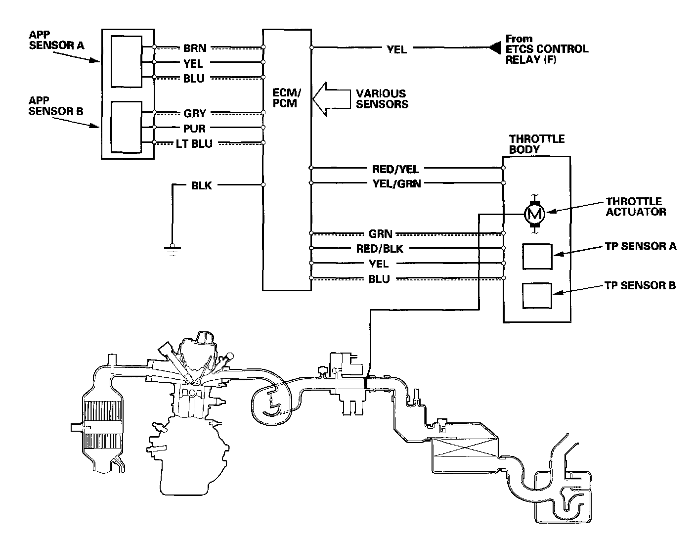 The electronic throttle control system consists of the throttle actuator, throttle position (TP) sensor A/B, accelerator pedal position (APP) sensor A/B, electronic throttle control system (ETCS) control relay (F), and the ECM/PCM.