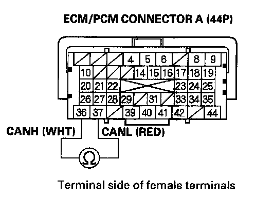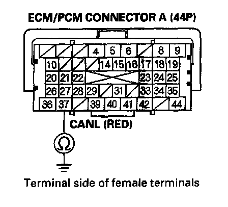 4. Measure resistance between ECM/PCM connector terminals A36 and A37.