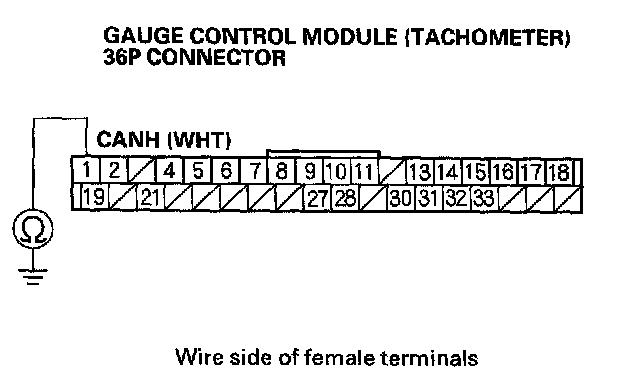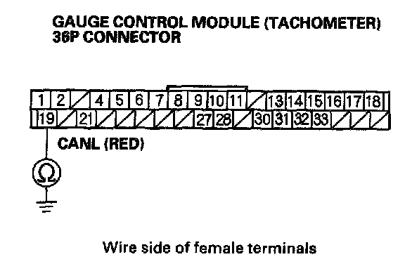 15. Check for continuity between gauge control module (tachometer) 36P connector terminal No. 19 and body ground.