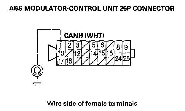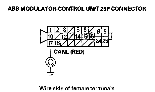 16. Check for continuity between ABS modulator-control unit 25P connector terminal No. 17 and body ground.