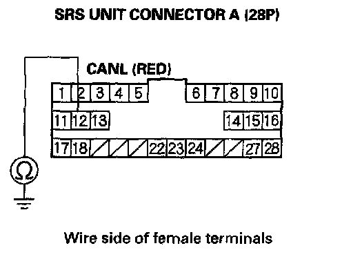 17. Check for continuity between SRS unit connector A (28P) terminal No. 12 and body ground.