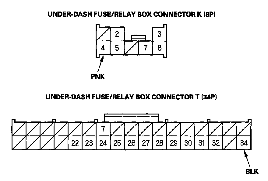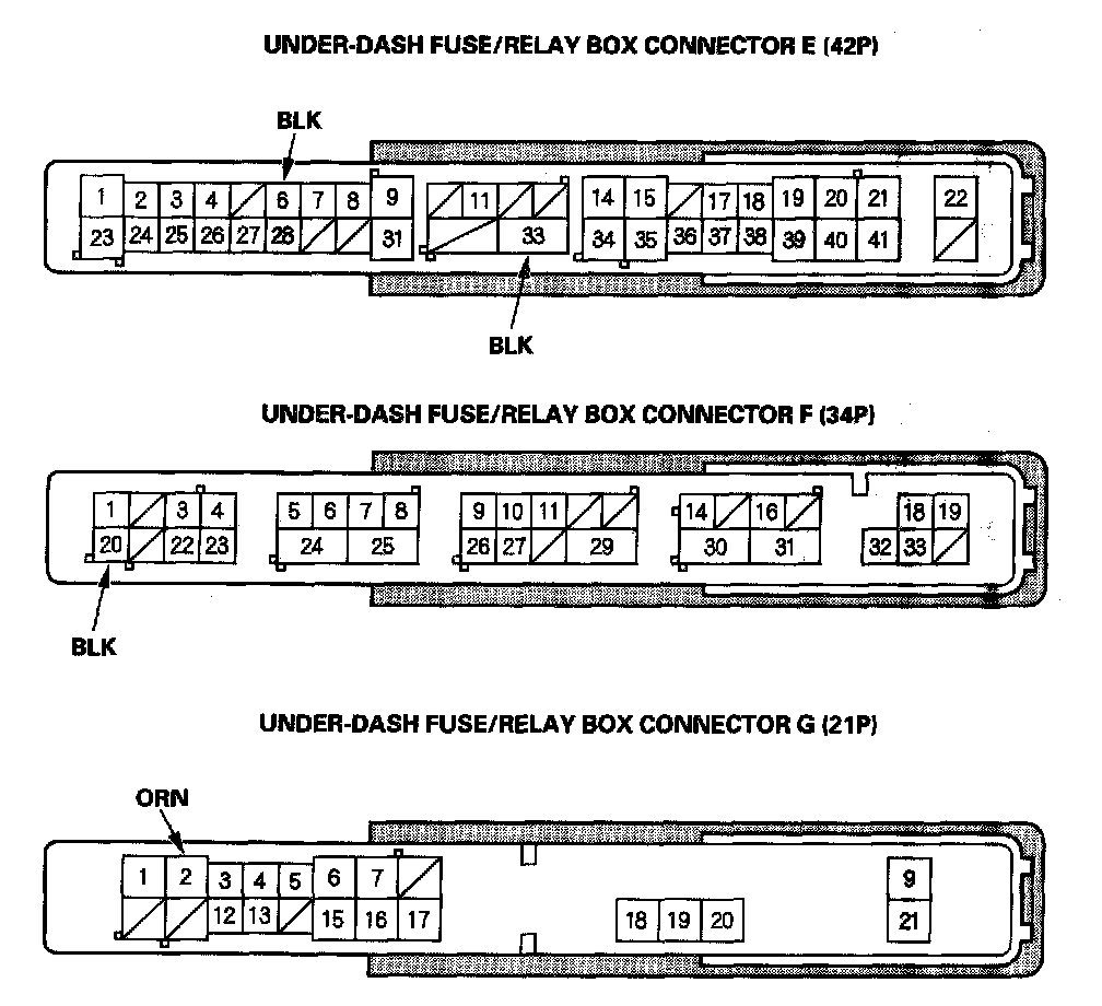 3. Disconnect the under-dash fuse/relay box connectors E, F, G, K, and T.