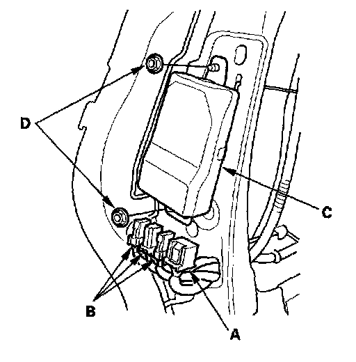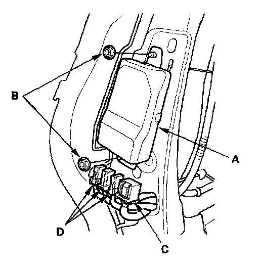 1. Place the new ODS unit (A) on the seat-back frame. Tighten the two nuts (B), and connect the ODS unit harness 18P connector (C) and sensor connectors (D) to the ODS unit.