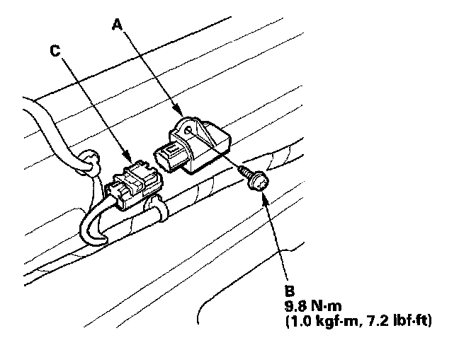 1. Install the new rear safing sensor (A) with a Torx bolt (B) then connect the floor wire harness 4P connector (C) to the rear safing sensor.