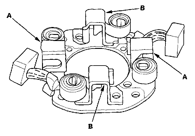 12. Check for continuity between the (+) brush (A) and (-) brush (B). If there is continuity, replace the brush holder assembly.
