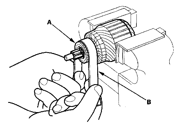 17. Hold the drive gear (B), and turn the overrunning clutch in the direction shown to make sure it turns freely. Also make sure the overrunning clutch locks in the opposite direction.