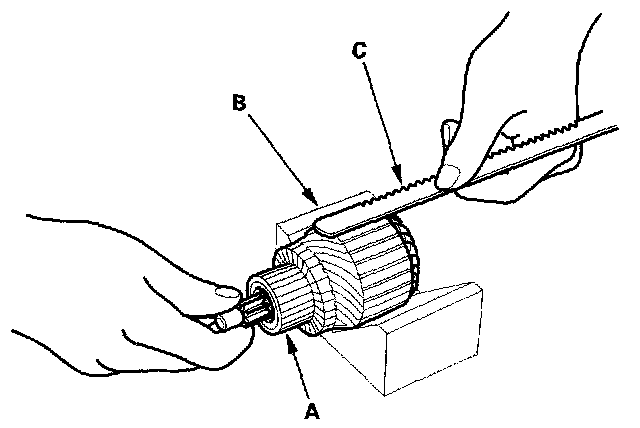 9. Place the armature (A) on an armature tester (B). Hold a hacksaw blade (C) on the armature core. If the blade is attracted to the core or vibrates while the core is turned, the armature is shorted. Replace the armature.