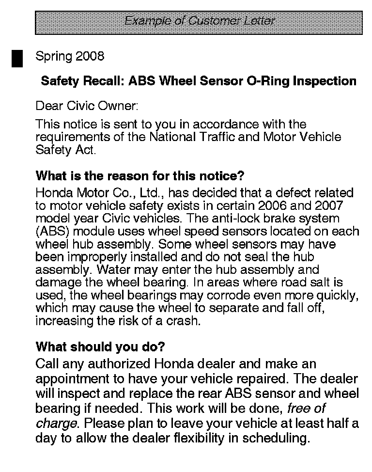 Recall - Rear Wheel Speed Sensor Inspection/Replacement