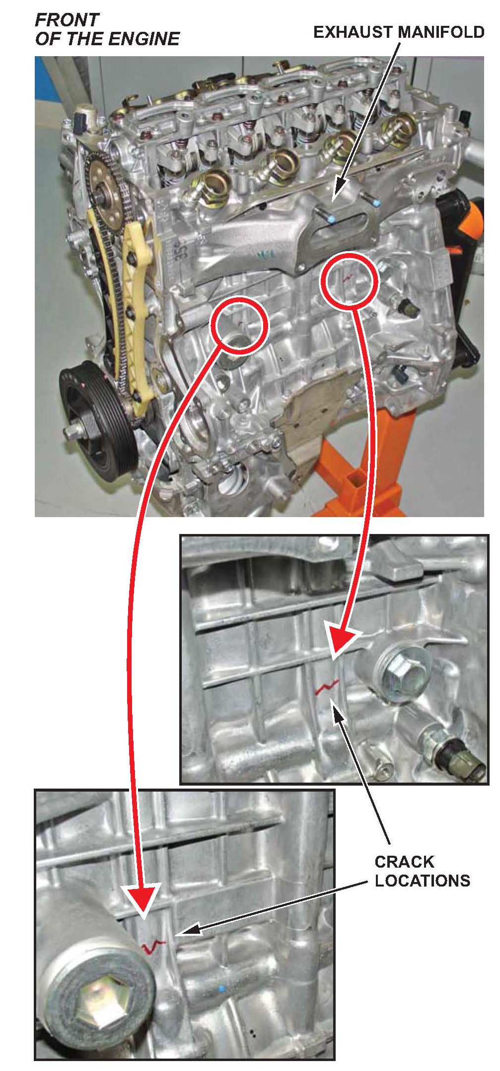 Look for coolant leaking from cracks in the block at the points shown below. On the back side of the engine, remove the oil/air separator cover so you can check beneath it. Pressure-test the cooling system if needed.