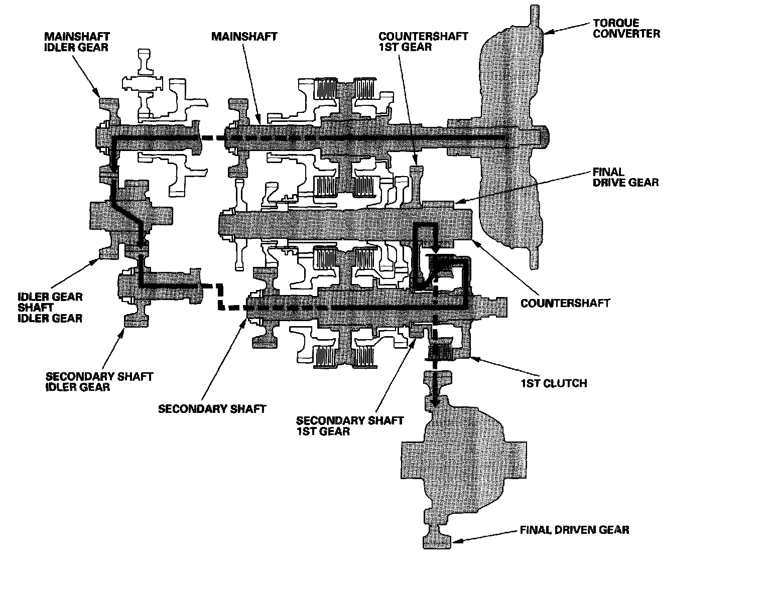 ^ Hydraulic pressure is applied to the 1st clutch, then the 1st clutch engages the secondary shaft 1st gear with the secondary shaft.