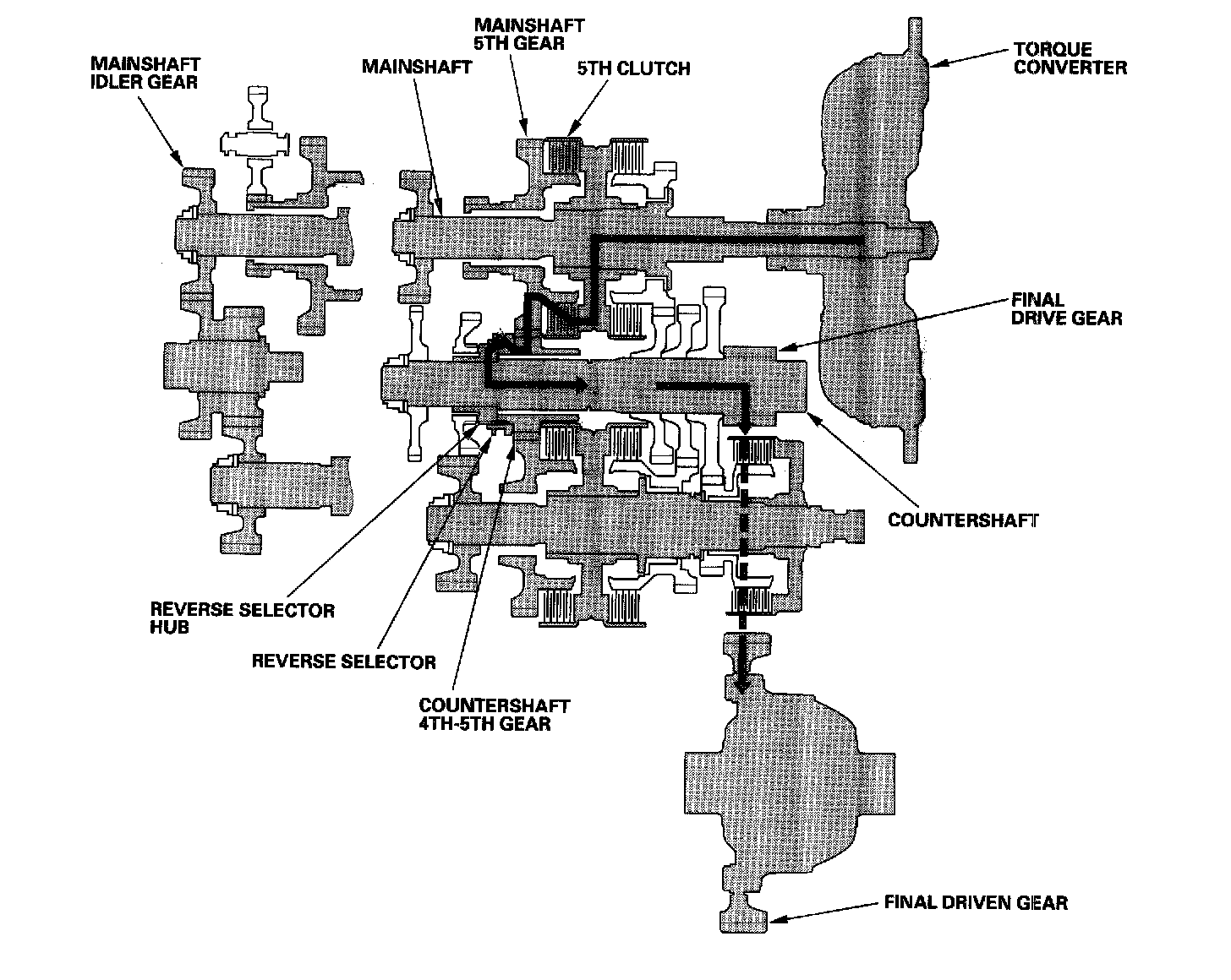 Engine power transmitted from the torque converter drives the mainshaft idler gear, the idler gear shaft idler gear, and the secondary shaft idler gear, but hydraulic pressure is not applied to the clutches. Power is not transmitted to the countershaft. In this position, the position of the reverse selector differs according to whether the shift lever shifted from D or R position: