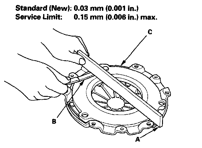 6. Inspect for warpage using a straight edge (A) and a feeler gauge (B). Measure across the pressure plate (C). If the warpage is more than the service limit, replace the pressure plate.