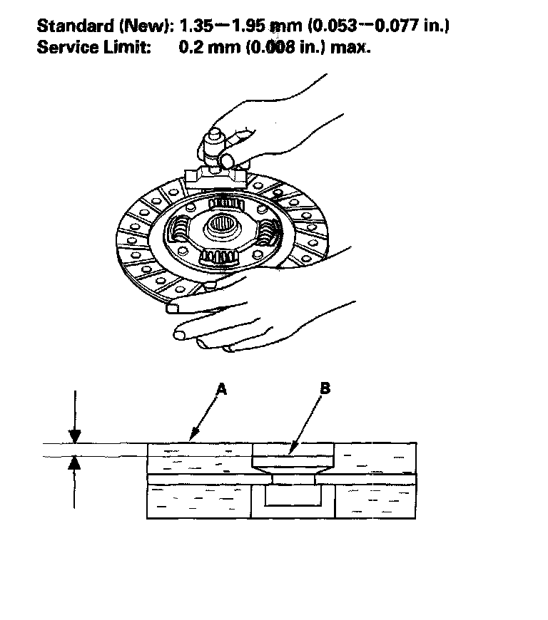 10. Measure the rivet depth from the clutch disc lining surface (A) to the rivets (B) on both sides. If the rivet depth is less than the service limit, replace the clutch disc.