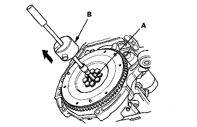 1. Remove the crankshaft pilot bushing (A) using the commercially available tools (B).