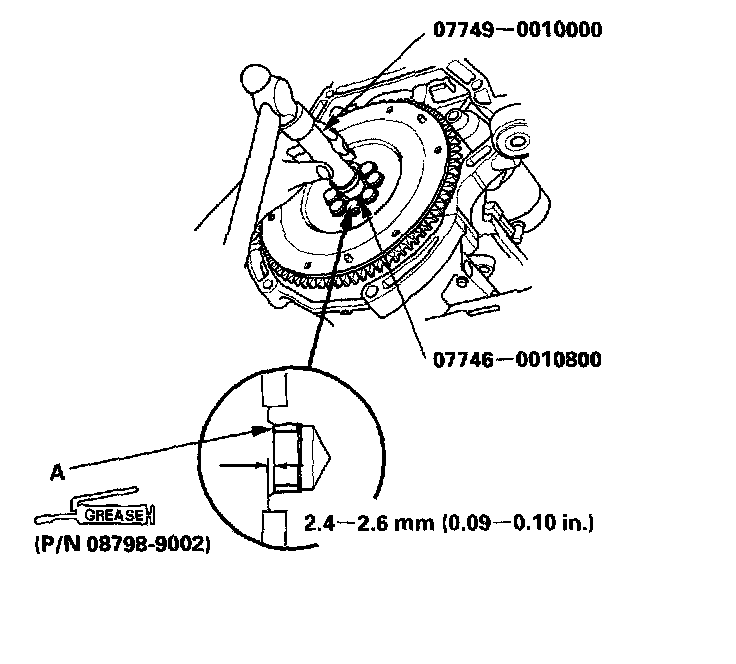 2. Install the new crankshaft pilot bushing (A) into the crankshaft using the special tools. Apply a light coat of super high temp urea grease (P/N 08798-9002) to the crankshaft pilot bushing surface.