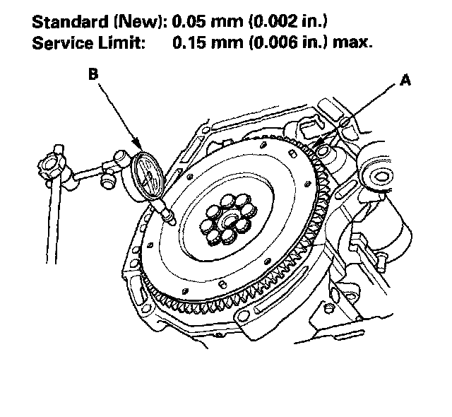 3. Measure the flywheel (A) runout using a dial indicator (B) through at least two full turns with the engine installed. Push against the flywheel each time you turn it to take up the crankshaft thrust washer clearance. If the runout is more than the service limit, replace the flywheel, and recheck the runout. Resurfacing the flywheel is not recommended.
