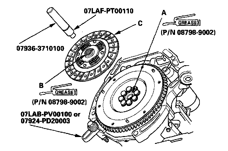 4. Apply super high temp urea grease (P/N 08798-9002) to the splines (B) of the clutch disc (C), then install the clutch disc using the special tools.