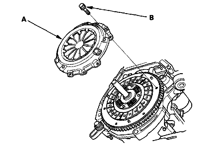 3. To prevent warping, unscrew the pressure plate mounting bolts (A) in a crisscross pattern in several steps, then remove the pressure plate (B).