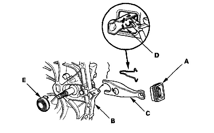 7. Install the release fork boot (E). Make sure the boot seals around the release fork and clutch housing.