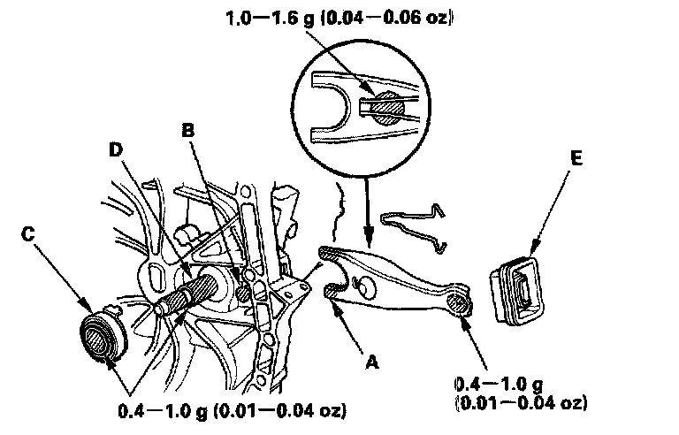 2. Remove the release fork (C) from the clutch housing by squeezing the release fork set spring (D) with pliers. Remove the release bearing (E).