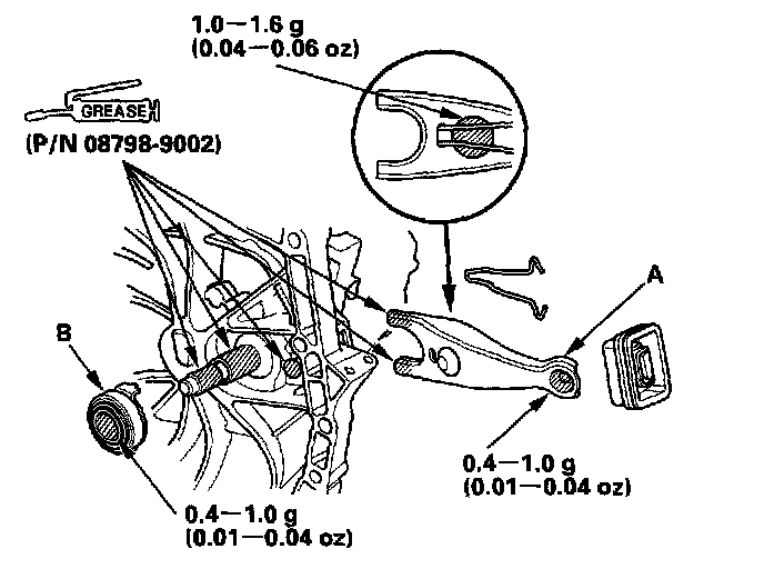 3. Apply super high temp urea grease (P/N 08798-9002) to the release fork (A) and the release bearing (B). Install the release fork, the release bearing, and the boot (C).
