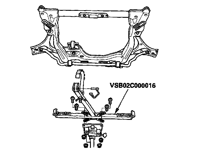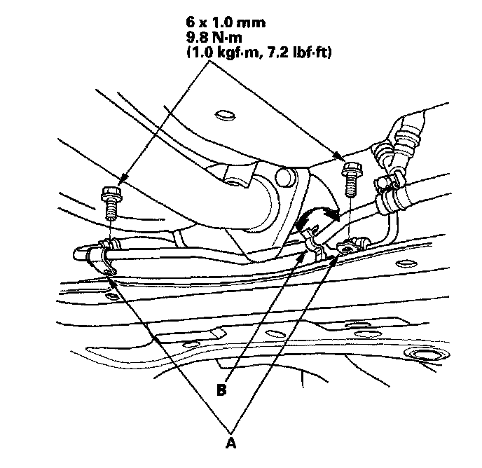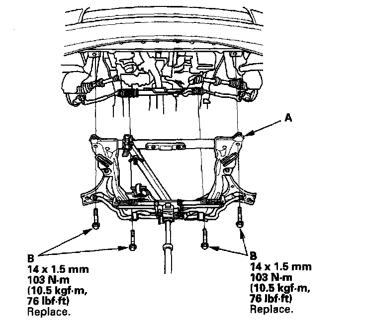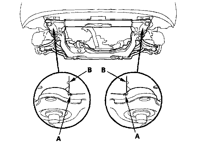 11. Align the front subframe reference marks (A) to the body (B), as noted during removal. Tighten the subframe mounting bolts to the specified torque.
