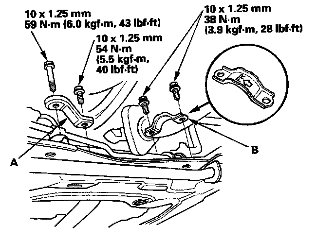18. Install the transmission mounting bracket base (A) and stud bolts (B).