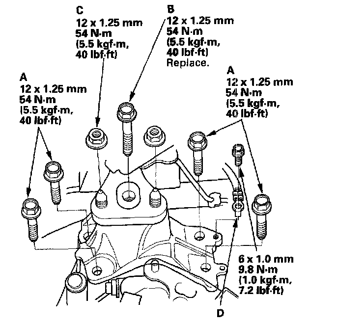 19. Install the transmission mounting bracket bolts (A). Install the transmission mounting bolt (B) and nuts (C), then install the ground cable (D).