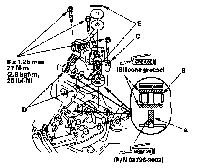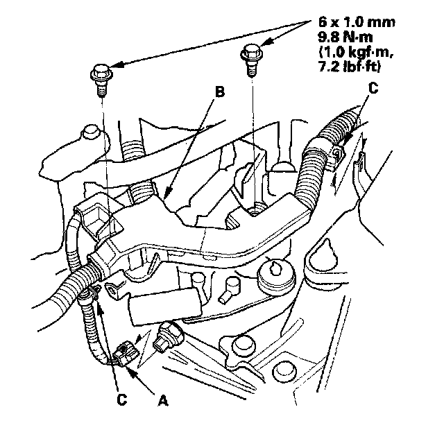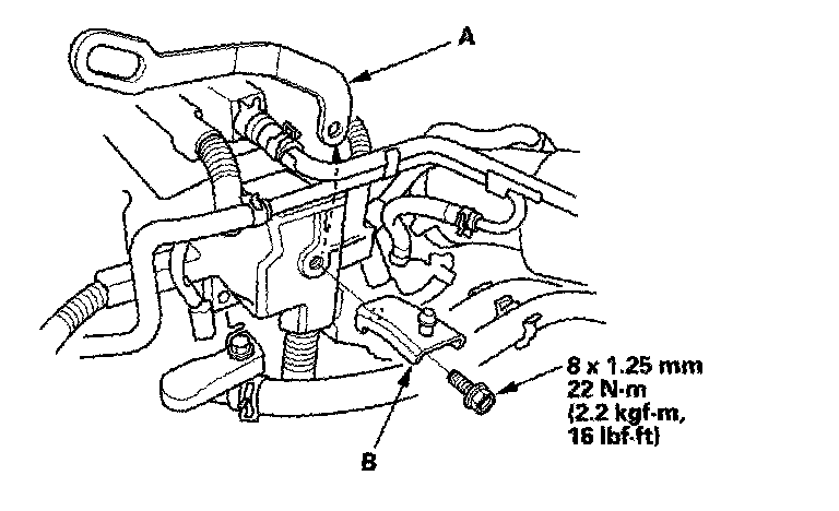 25. Install the harness holder bracket (B) and air cleaner housing bracket on the cylinder head,