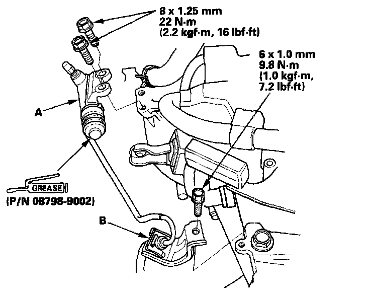 30. Apply super high temp urea grease (P/N 08798-9002) to the end of the cylinder rod. Install the slave cylinder (A) then install the clutch line bracket (B). Be careful not to bend the clutch line.