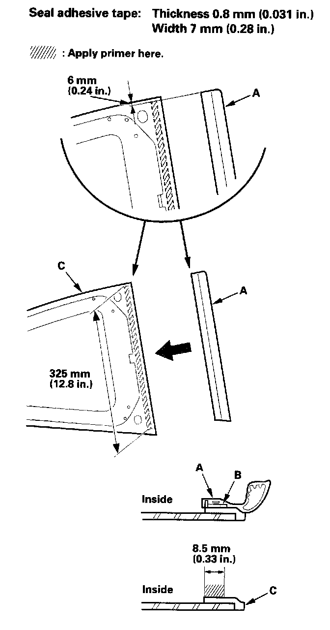 12. Attach the front seal (A) with adhesive tape (B) onto the molding (C).