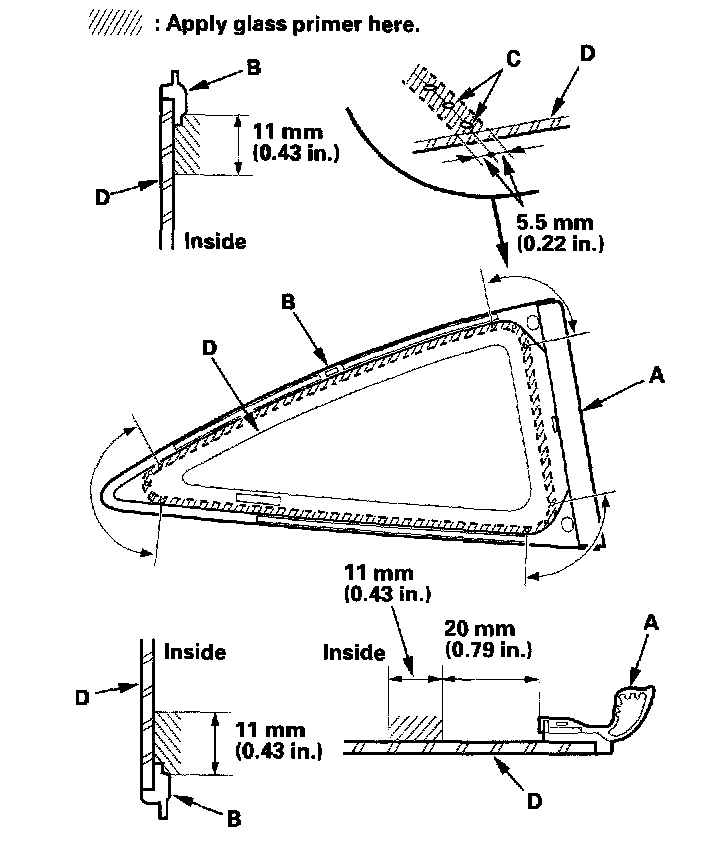 - With the printed dots (C) on the quarter glass (D) as a guide, apply the glass primer to the front portion of the quarter glass.