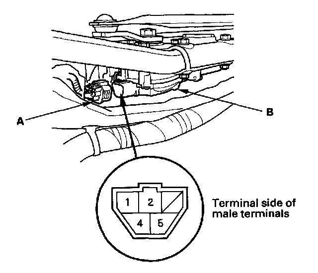 3. Disconnect the 5P connector (A) from the wiper motor (B).