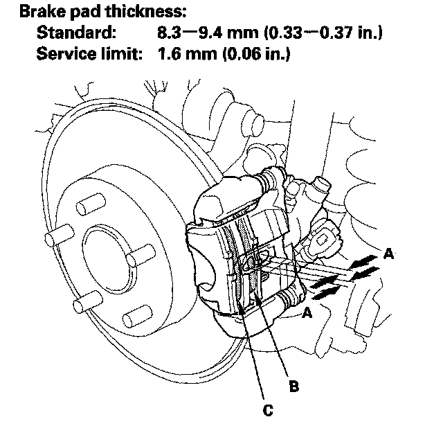 3. Check the thickness (A) of the inner pad (B) and outer pad (C). Do not include the thickness of the backing plate.