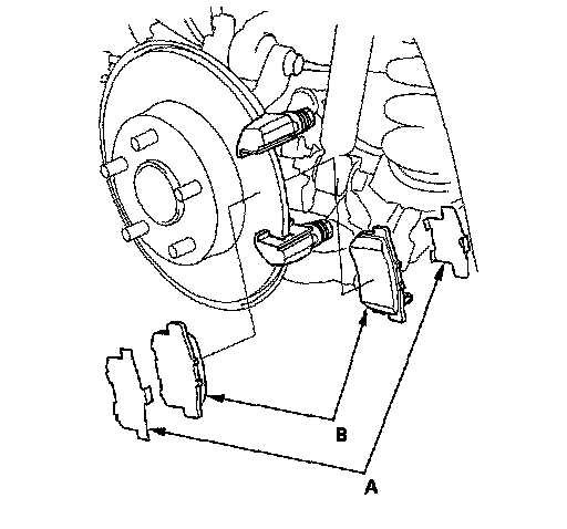 5. Remove the pad shims (A) and brake pads (B).
