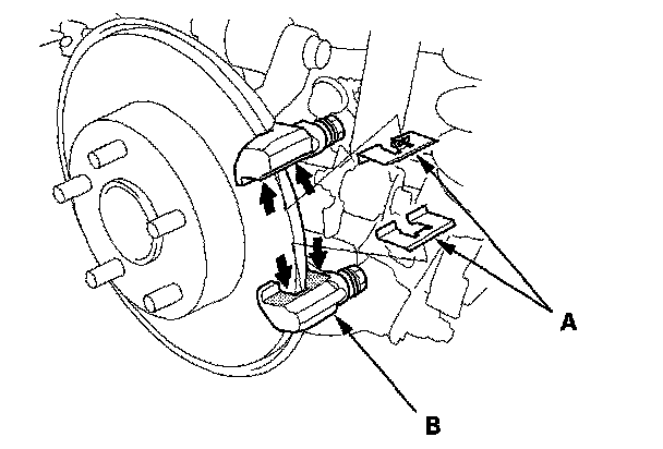 7. Clean the caliper bracket (B) thoroughly; remove any rust, and check for grooves and cracks.